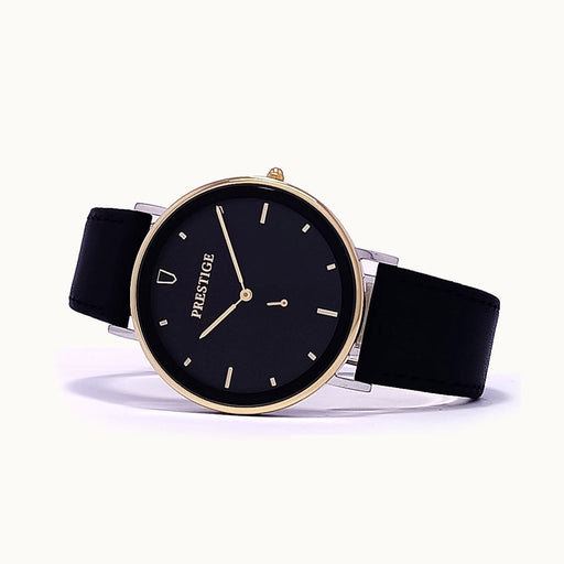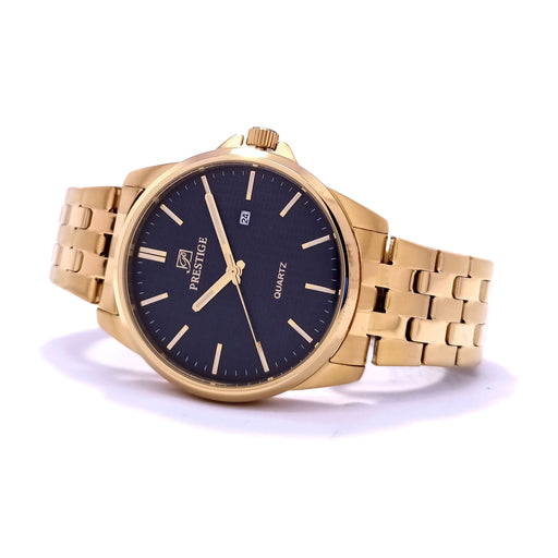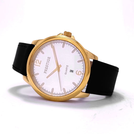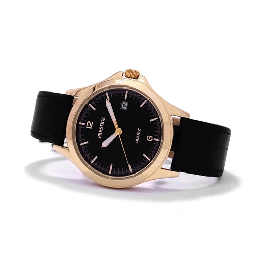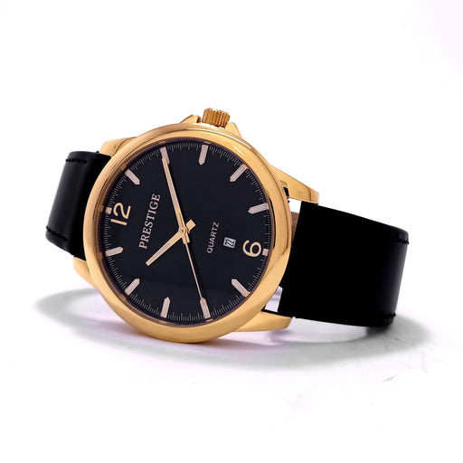 PrestigeDial Color: BlackCase Material: Gold Plated Stainless SteelStrap: LeatherGender: Men’sWater Resistance: 30 MetersMovement: 3 Hands & DateWarr...
