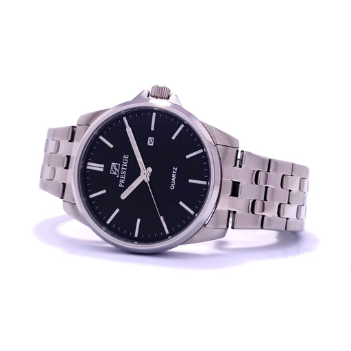 PrestigeDial Color: BlackCase Material: Silver Plated Stainless SteelBand: Stainless Steel Link BraceletGender: Men’sWater Resistance: 30 MetersMovement:...