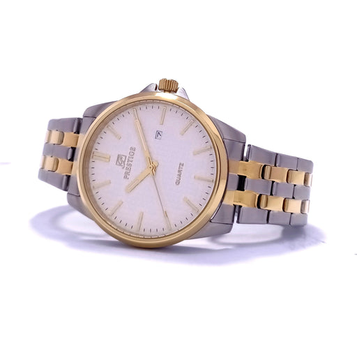 PrestigeDial Color: WhiteCase Material: Gold & Silver Plated Stainless SteelBand: Stainless Steel Link BraceletGender: Men’sWater Resistance: 30 Mete...