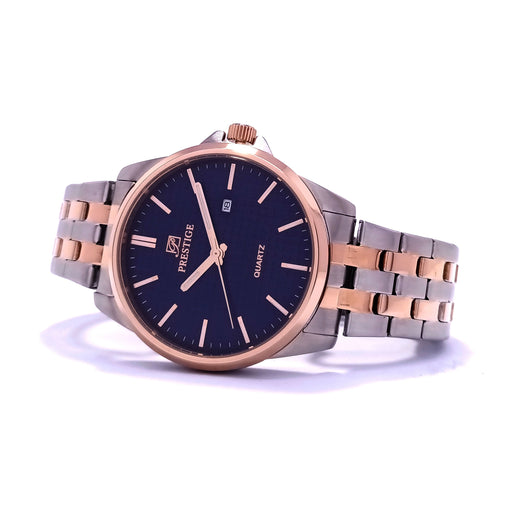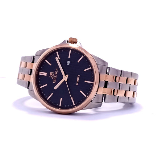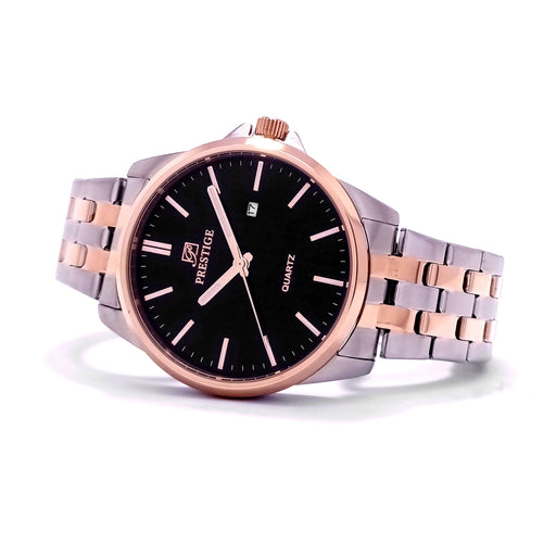 PrestigeDial Color: BlackCase Material: Rosegold & Silver Plated Stainless SteelBand: Stainless Steel Link BraceletGender: Men’sWater Resistance: 30 ...