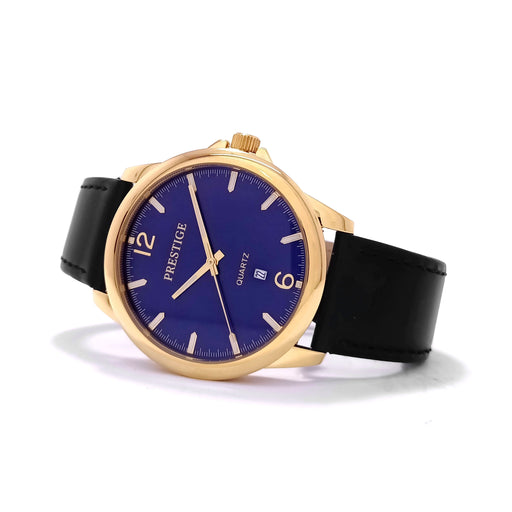 PrestigeDial Color: BlueCase Material: Gold Plated Stainless SteelStrap: LeatherGender: Men’sWater Resistance: 30 MetersMovement: 3 Hands & DateWarra...