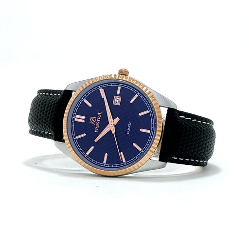 PrestigeDial Color: BlueCase Material: Rosegold & Silver Plated Stainless SteelStrap: Genuine Leather StrapGender: Men’sWater Resistance: 30 MetersMo...