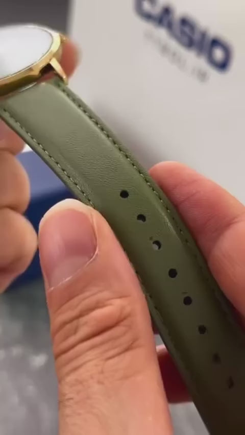 CasioCase / bezel: Gold toneLeather BandMineral GlassWater ResistantDate displayRegular timekeeping3 hands (hour, minute, second)Accuracy: ±20 seconds p...