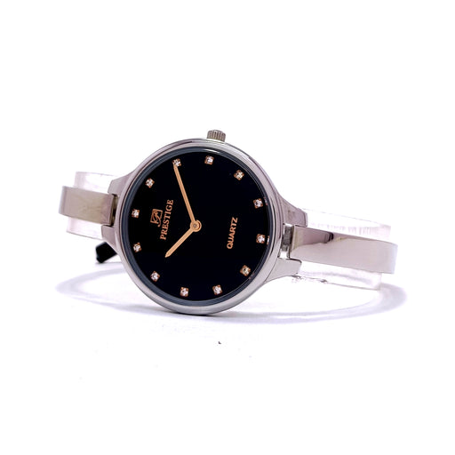PrestigeDial Color: BlackCase Material: Silver Plated Stainless SteelStrap: Silver Plated Bangle Syle Link BreceletGender: Women’sWater Resistance: 30 Mete...