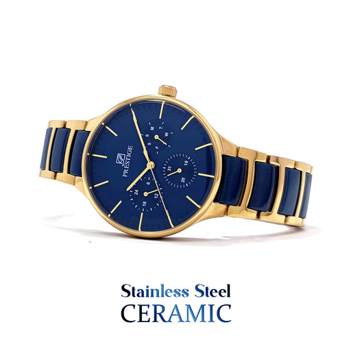 PrestigeDial Color: BlueCase Material: Gold Plated Stainless SteelStrap: Gold Plated Stainless Steel & Ceramic LinkGender: Men’sWater Resistance: 30 Me...